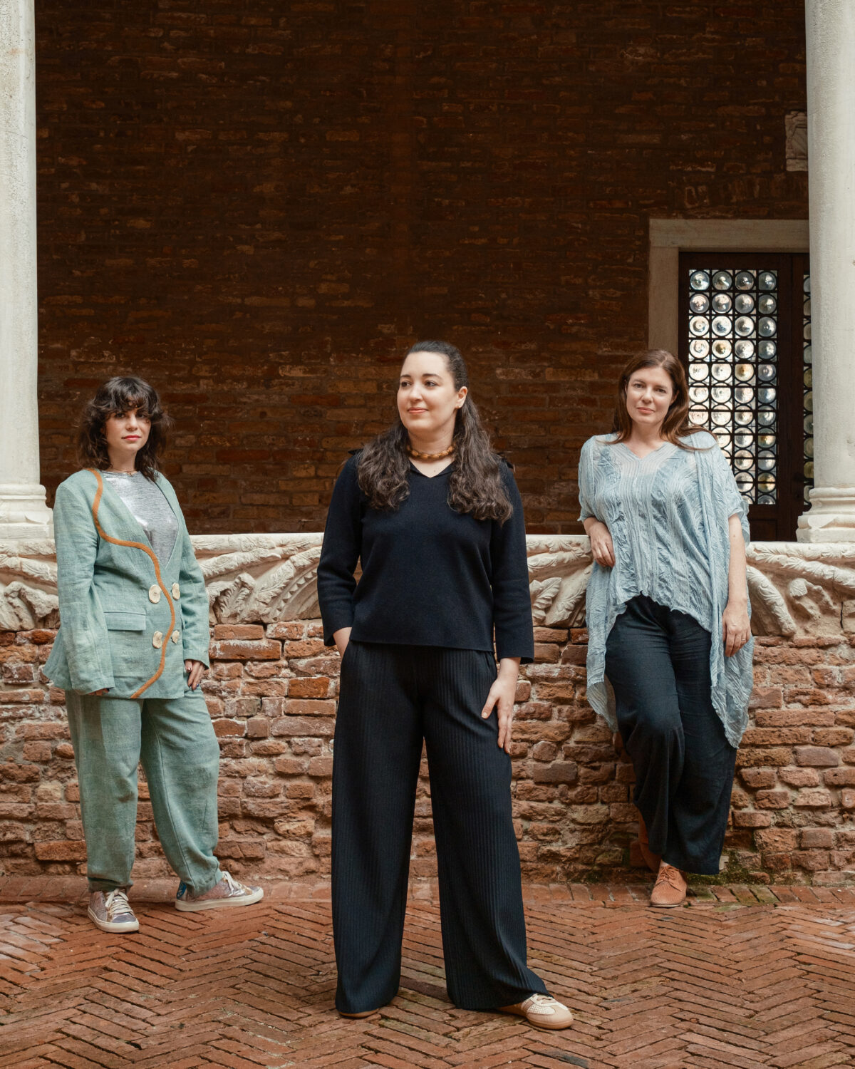 Image 1: Left to right: Hafsa Alkhudairi, Dana Awartani, Antonia Carver, Venice, 2025. Photography by Alvise Busetto. Image courtesy of the Ministry of Culture.